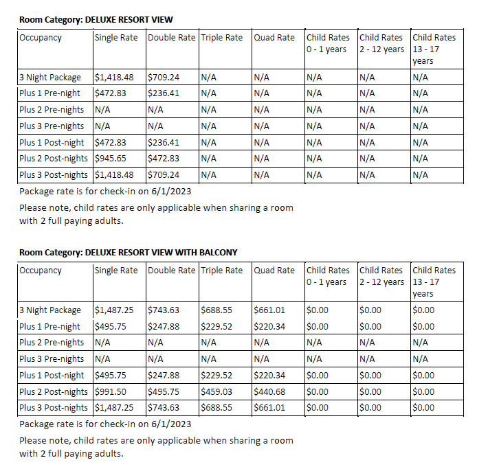 * Max occupancy is 4 per room except for the Deluxe Resort View which fits a max of 2.