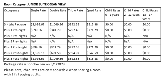 The room categories listed above were selected by the couple for their contracted room block. There are only a certain number of rooms available in each category and they are available on a first come, first serve basis.
