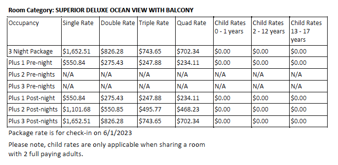 If you would like to upgrade to a different room category (not listed above) you have the option to do so based on availability, all you need to do is let MarieSam know the upgraded room category you are interested in when you contact her.